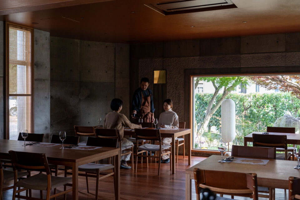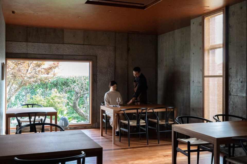 窓から見える借景。自然光が照らす店内に、天井の銅の質感と色合いがアクセントを添えています。