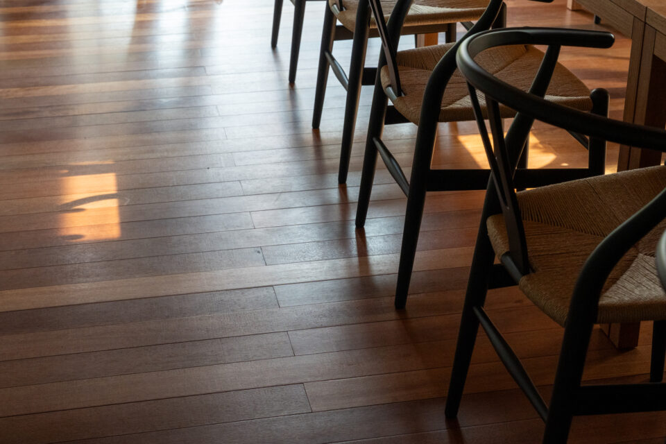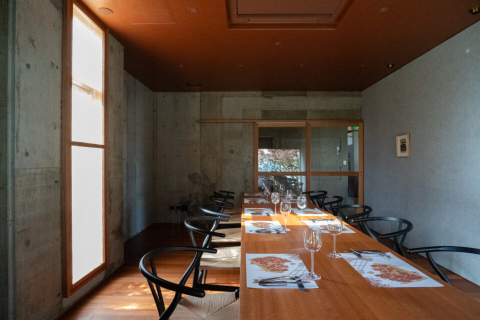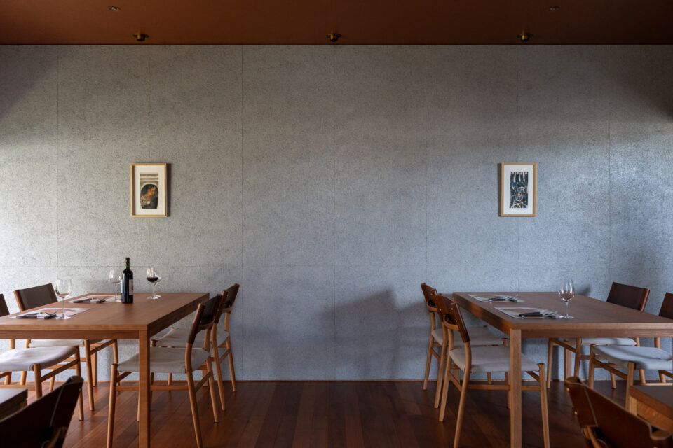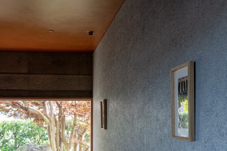 今回のリノベーションで、新設した間仕切り壁には木毛セメント板をセレクト。その細かな凹凸と、天井のLIQUID COPPERが創り出す陰影の揺らぎ。そして床の無垢材の暖かな色合い。レストランで過ごす穏やかな時間の経過とともに、印象が変化していきます。